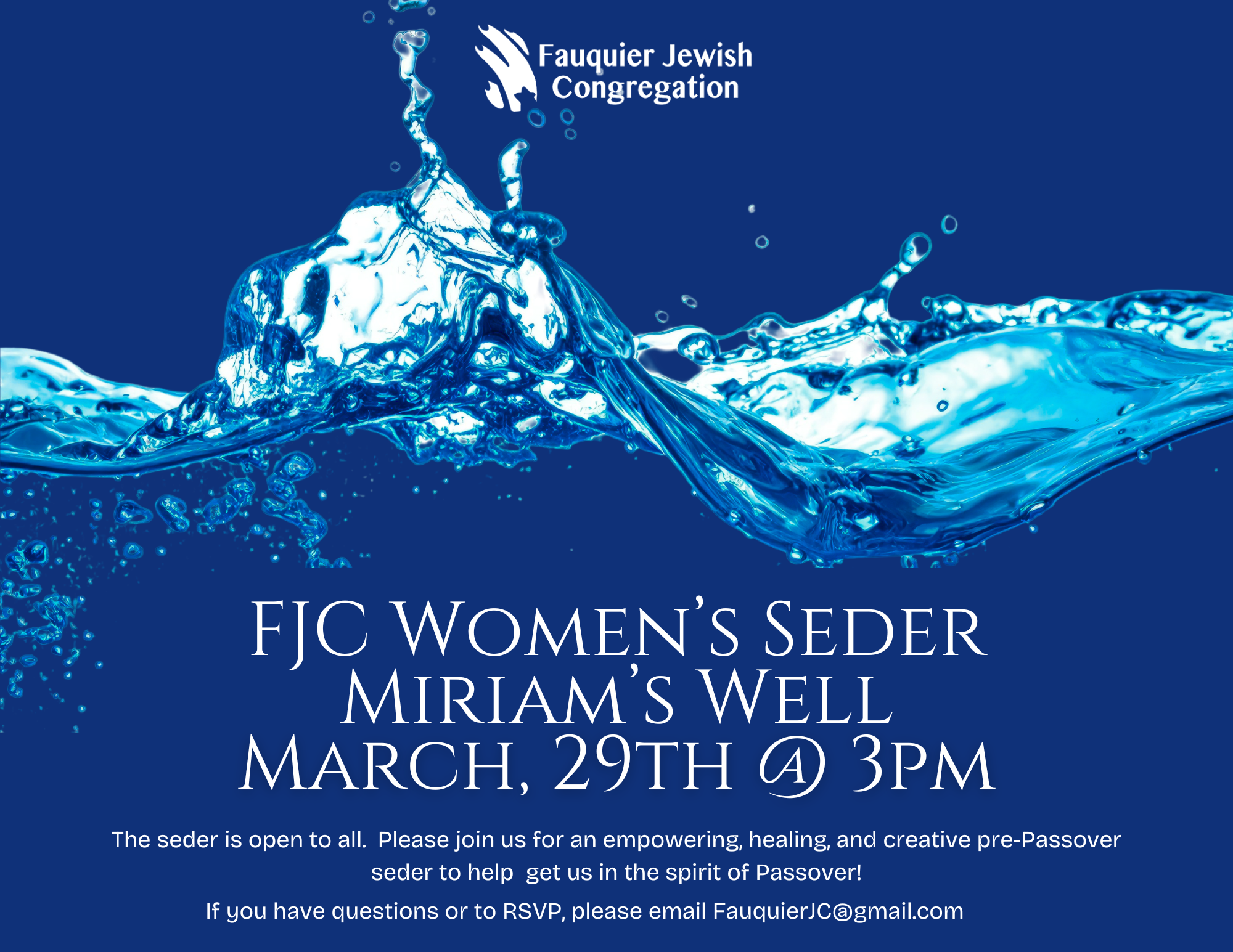 Sunday, March 29th @ 3pm - Please join our annual women’s seder. This year’s theme is Miriam’s Well: Nourishing Each Other on Our Journey. The seder is open to all. If you have questions or want to RSVP please email Fauquierjc@gmail.com. For the security of all participants in the seder, location will be sent following registration.